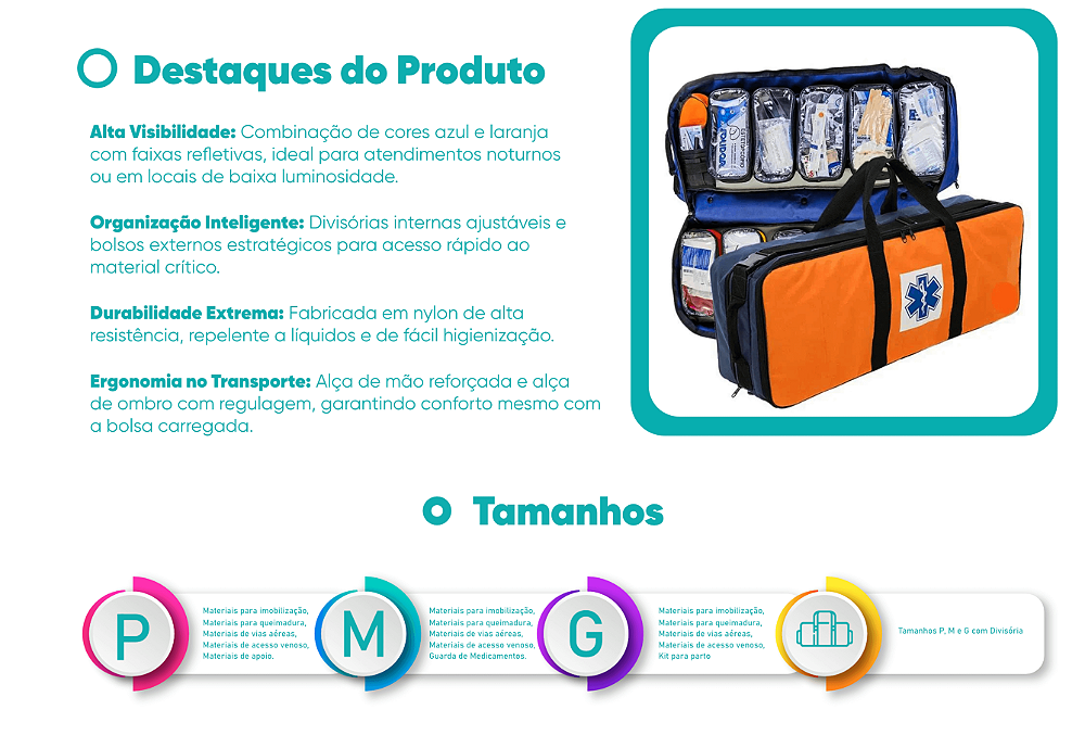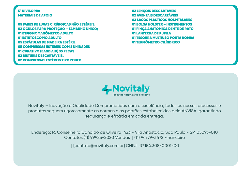 MATERIAIS PARA PRIMEIROS SOCORROS, ACONDICIONADOS EM 7 BOLSAS COLORIDAS E FIXADAS POR VELCRO