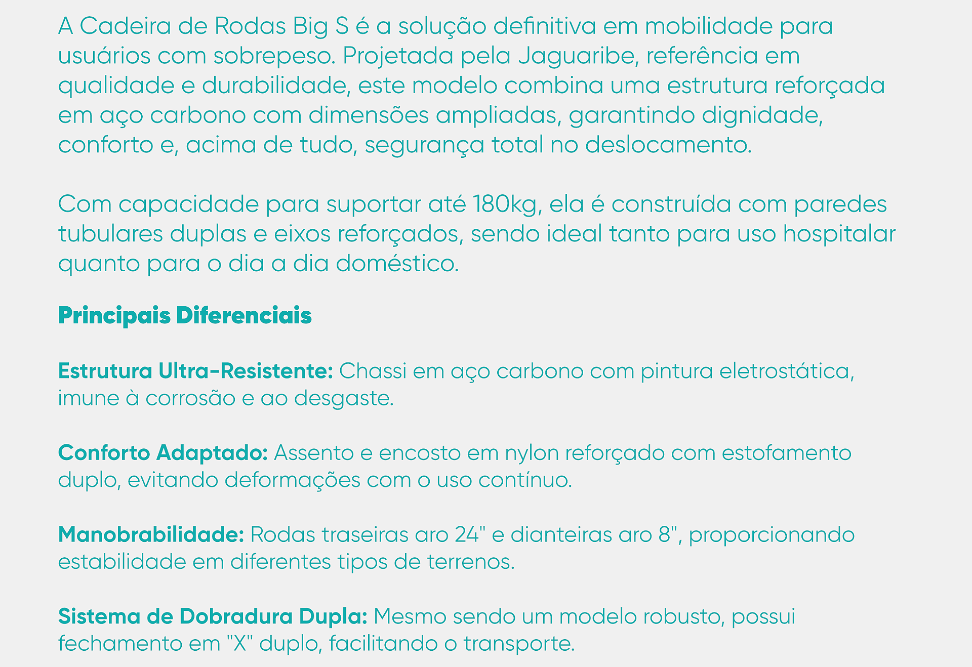 A Cadeira de Rodas Big S é a escolha ideal para quem busca qualidade, resistência e conforto em uma cadeira de rodas robusta, projetada para um uso prático e seguro.
