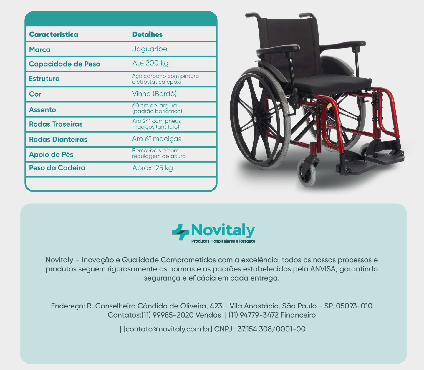 A Cadeira de Rodas Super Big Dobrável 200KG da Novitaly é a solução robusta e confortável que você procura para cuidados hospitalares e resgate. Projetada com qualidade e resistência, essa cadeira de rodas suporta até 200 kg e oferece segurança e conforto ao usuário. Fabricada em aço carbono com parede dupla e acabamento em pintura epoxy, possui um design dobrável em duplo X, que facilita o transporte e armazenamento.