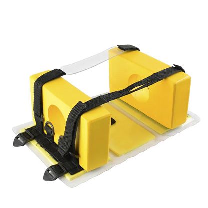 O Imobilizador de Cabeça Adulto é produzido em ABS e preso com velcro ao tecido que reveste a prancha, este artigo possui dois cintos de imobilização reguláveis para testa e queixo, é resistente a impactos e possui orifício auricular de 80 mm para verificação de sangramento, seu material de espuma de vinil emborrachada, torna este imobilizador de cabeça impermeável e lavável.