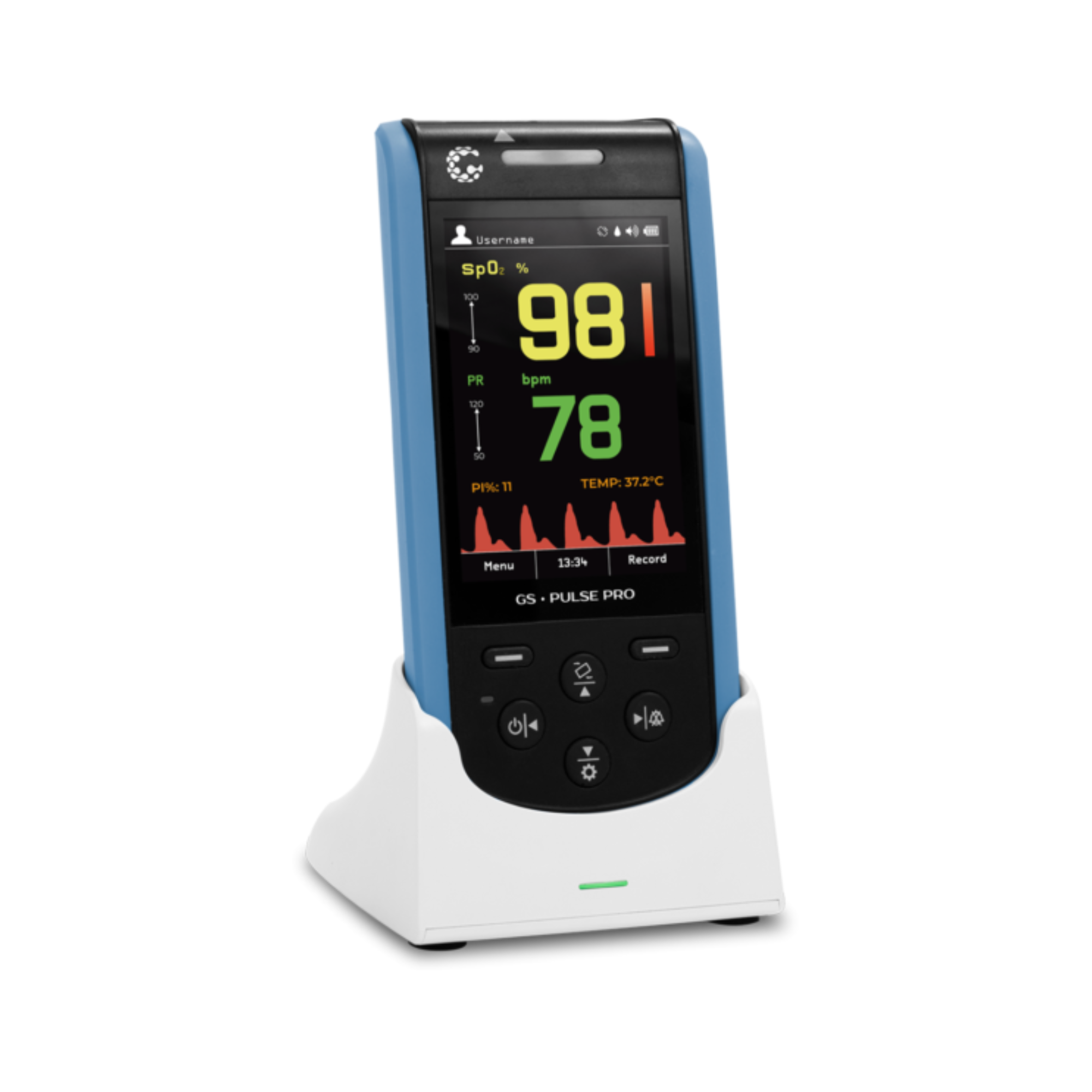 - Com display colorido e intuitivo, o GS Pulse Pro apresenta leitura em tela dos seguintes dados: saturação periférica de oxigênio (SpO2), frequência de pulso (PR), temperatura corporal (na utilização do sensor), índice de perfusão (PI) e curva pletismográfica.